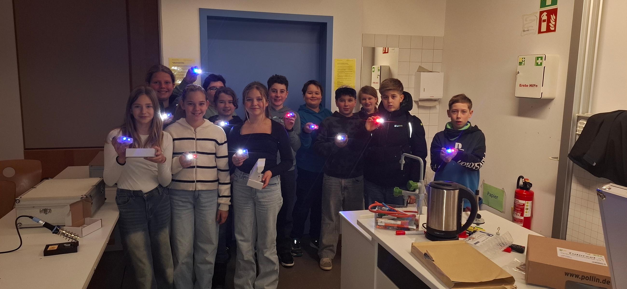 Im weiteren Verlauf des Kurses arbeiteten die Kinder mit großem Engagement an verschiedenen elektronischen Bausätzen und lernten dabei grundlegende Bauteile wie Widerstände, LEDs und Transistoren kennen. Besonders schön war zu beobachten, wie sich die Schülerinnen und Schüler gegenseitig unterstützten und voneinander lernten.