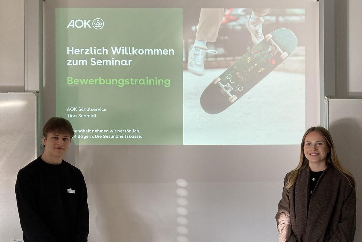 (SE) Im Rahmen der Berufsorientierung besuchte die AOK, vertreten durch Frau Tina Schmidt und Herrn Benedikt Butz, Ende Januar die beiden 9. Klassen und führte ein praxisnahes Bewerbungstraining durch.